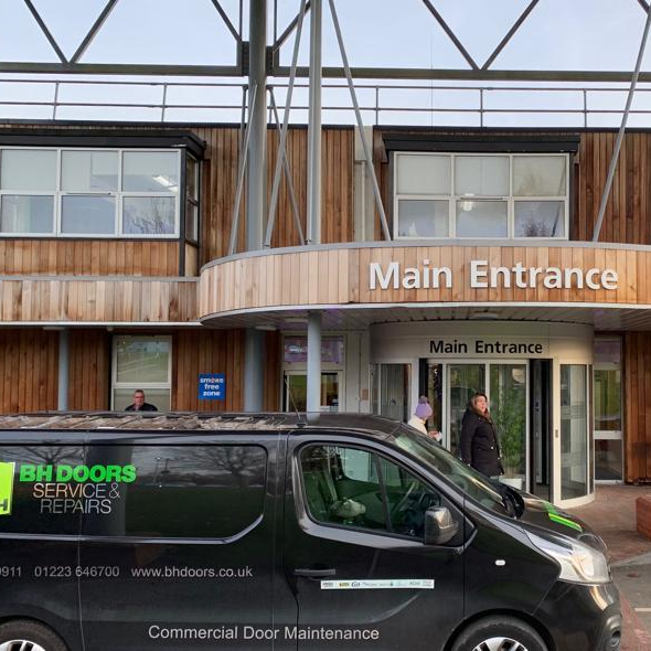 Automatic Glass Door Service In Cambridgeshire We repaired an automatic door at Hinchingbrooke hospital in Cambridgeshire. This involved supplying and fitting a panic bar and external lockable handle. Once repaired the door worked smoothly.